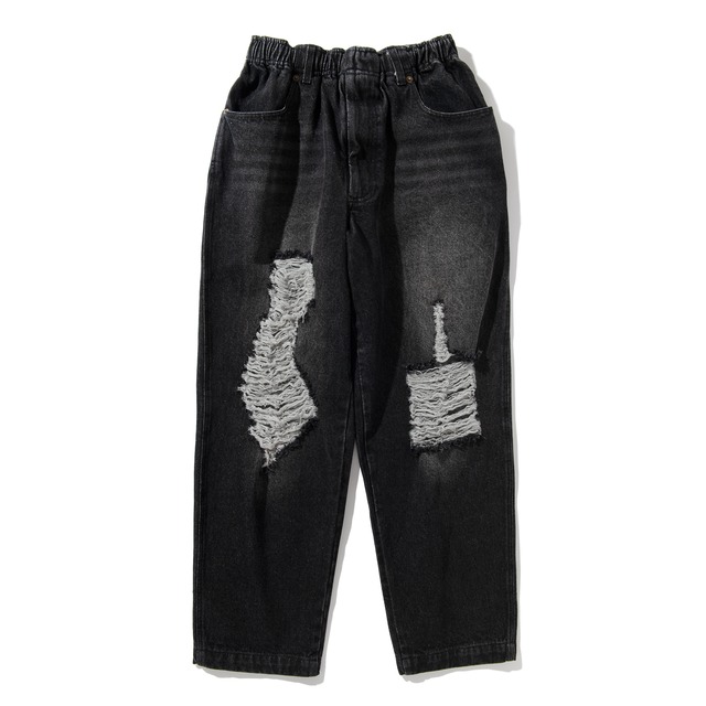 Acy定番シルエットのデニムパンツになります。 ウエストにはドローコードが付いておりダメージ加工が施されたパンツになります。