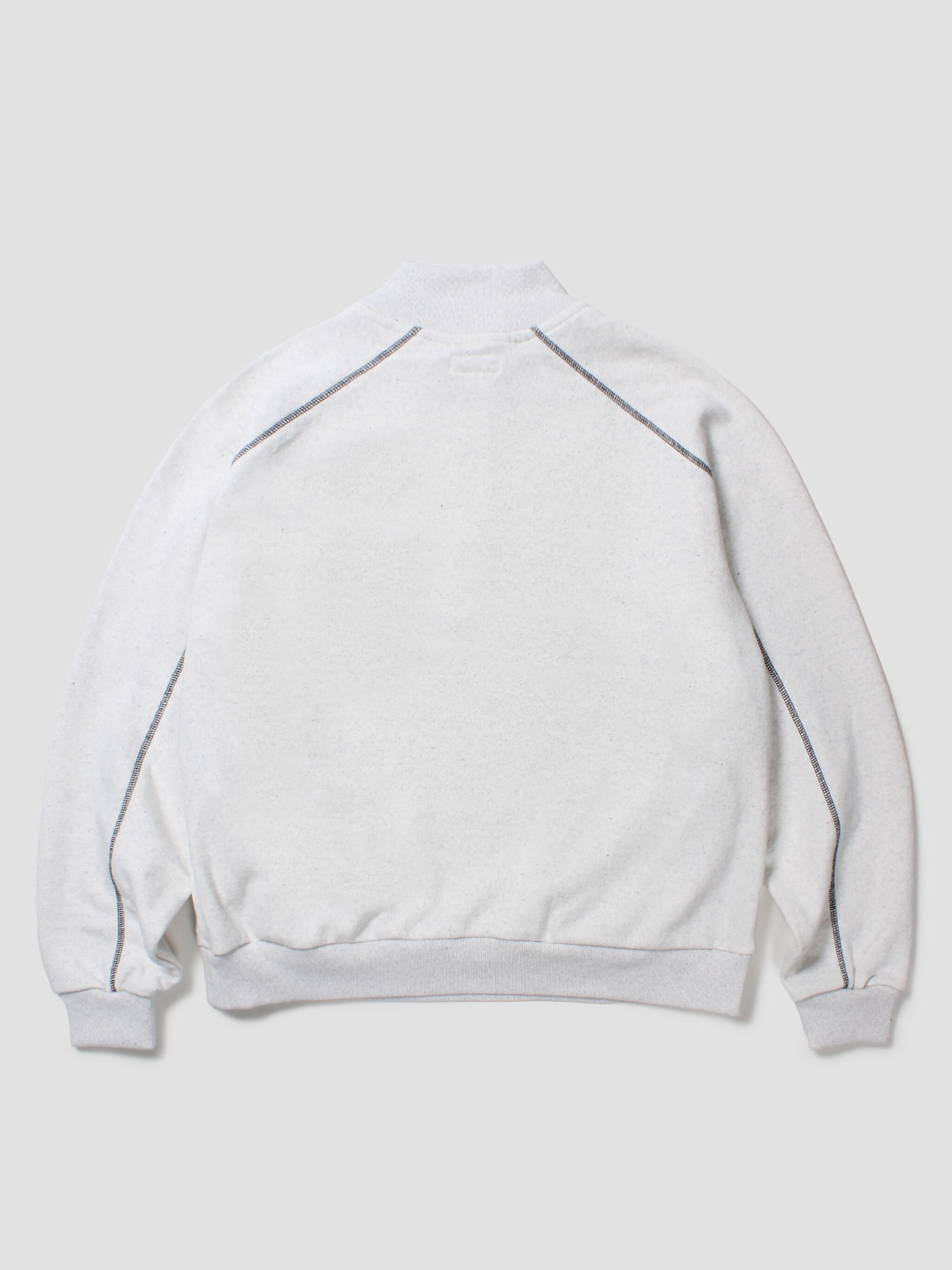 縫い繋ぎ部分に配色の3本針ステッチを走らせたハーフジップスウェット。