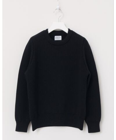 シルクのような光沢とカシミヤのような滑らかな肌触りを持つ高級ウールを、しっかりと編み込んだ畦編みのニット。可能な限り装飾を削ぎ落としたシンプルなデザインが特徴。毛玉が起きにくく、ご家庭で手洗いによる洗濯処理ができる汎用性の高い定番商品です。