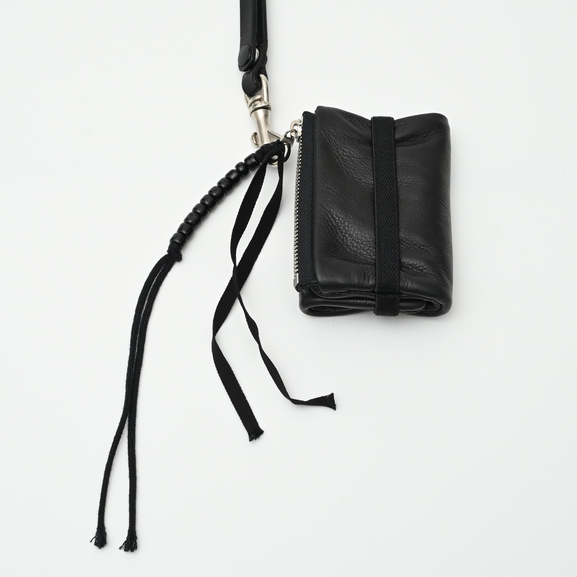 ファスナーの持ち手部分には黒ビーズとグログランテープを無造作に連ね、さりげないアクセント。
